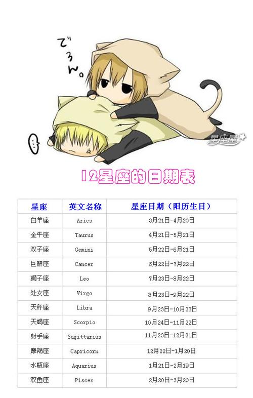扩展资料十二星座是黄道十二宫,占星术描述了白羊座、金牛座、双子座、巨蟹座、狮子座、室女座、天秤座、天蝎座、人马座、摩羯座、宝瓶座和双鱼座。