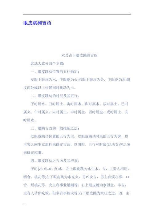 而眼皮跳测吉凶也是现代社会中非常流行的一种迷信现象。很多人在生活中会关注自己眼皮的跳动,并根据不同的跳动情况预测自己的吉凶。