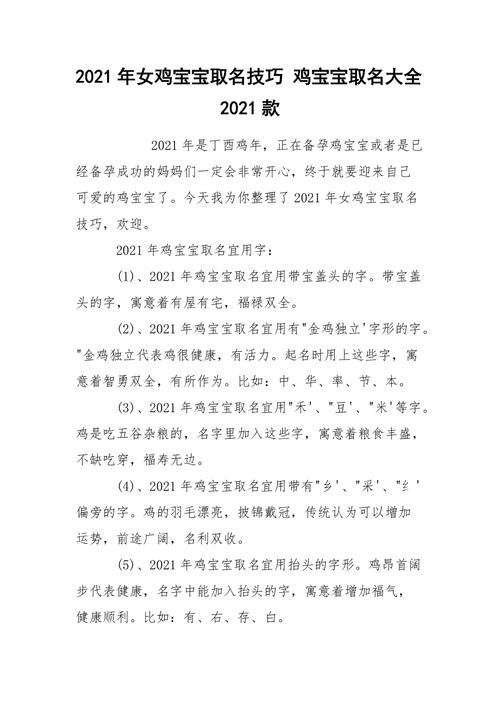 以上是鸡年出生的婴儿的完整命名。合理准确的命名对婴儿的成长和命运有很大的影响。因此,在命名之前,我们还应该注意婴儿的出生年份、八字等因素。综合考虑后,我们应该注意合理性、文化和美学。