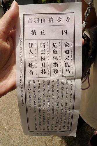 人们可以从神社或寺庙中提取这些小纸,通常在神社或寺庙的守护神面前,先投资一些钱,然后开始抽签。一个符号和一个预言或祝福通常写在纸上。符号分为吉祥、吉祥、吉祥、吉祥、凶猛和凶猛等。