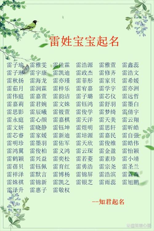 3. 雷姓女孩名字推荐根据上述原则和考虑到当前社会流行的风尚和文化特点,我们为你准备了一些优美的、有意义的雷姓女孩名字,可以供您参考。