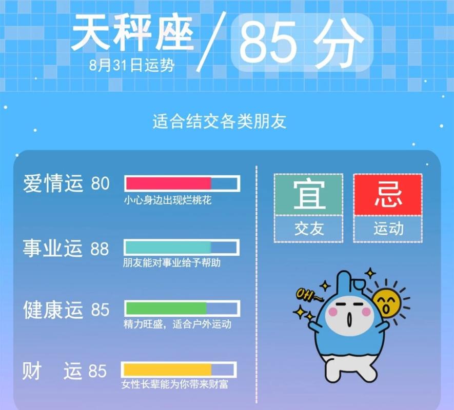 天秤座天秤座在2017年8月31日状态很好。今天,你的事业、财富和人际关系都很好,你有机会得到一些很好的机会。同时,你的情感运气也相对较好,有机会遇到你最喜欢的对象。