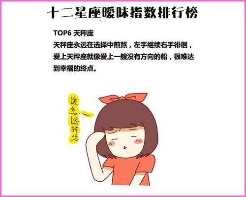 天秤座,做事情总想做得完美,一点点小遗憾,总是让他纠结不已,不知该放过,还是推倒重来,一直在想怎么样做得更好更完美。有更好的结果。比如,穿一件衣服去约会,总是选来选去,不知道自己穿什么衣服合适,在纠结中,时间慢慢的过去,而她却还没有做出决定,所以和这种星座的女朋友约会时,一定要有耐心,千万不要急躁,否则的话,不但得不到女朋友的好感,还会和女朋友产生矛盾。
