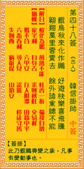 观音灵签第48签求解我求的事业?这封信(昆鸟)彭兴变,一切都变了。(昆鸟)鸟变成鹏,万禽不能,桂香一折,福禄增加。这个签约的家庭福利,自己的好运,财富旺盛,交易晚,婚姻不和谐,六甲安,行人阴,田蚕中平,六畜春利,寻人胜利,移居守旧,失物西寻,疾病祈福,山坟古人韩信挂帅。