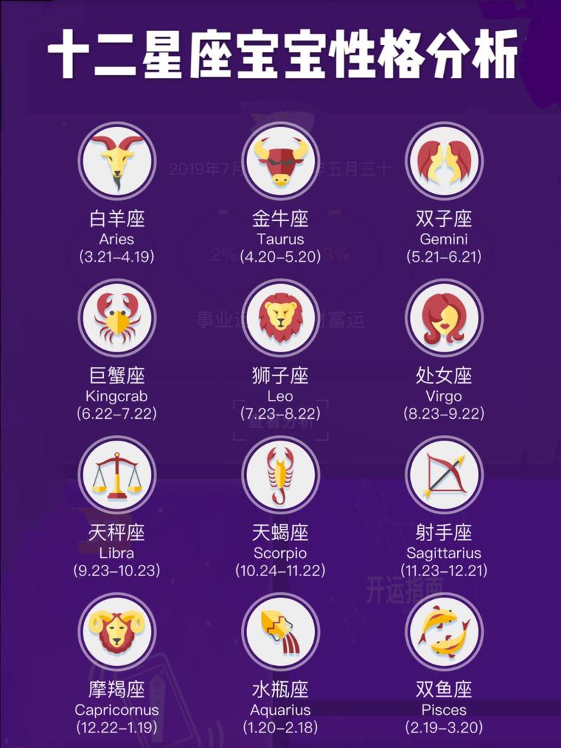 白羊座、金牛座、双子座、巨蟹座、狮子座、处女座、天秤座、天蝎座、射手座、摩羯座、水瓶座、双鱼座等12个星座。