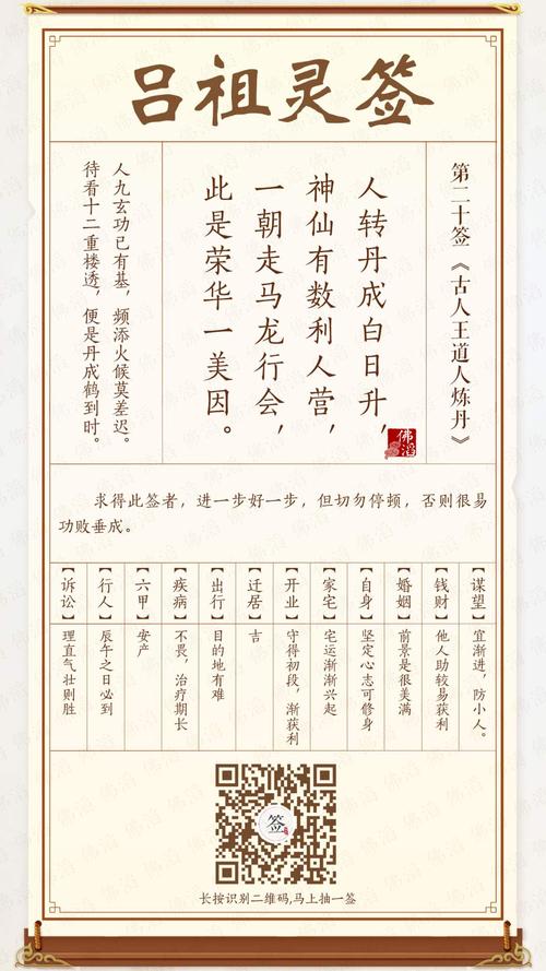 吕祖灵签第20签问自身古人王道人炼丹签文:九转丹成白日升,神仙有数利人营;一朝走马龙行会,此是荣华一美因。解曰:财运吉。做事有希望成功。他日功成之后,有荣华富贵可享。______________________________________________________二八签.古人赵子龙佐刘备签文:前生原是此家人,今世相逢定有因;龙虎呈祥天送子,五三六二是奇期。解曰:五三六二是奇期。乘马往西东,求为定必丰;休言心未遂,此去自亨通.浅解:你目前虽无荣华富贵,但只要尽人事就可成功。如果你见工的日期有五三六二这些数字,而你乘车是往西或东的方向去的话,是会成功的。