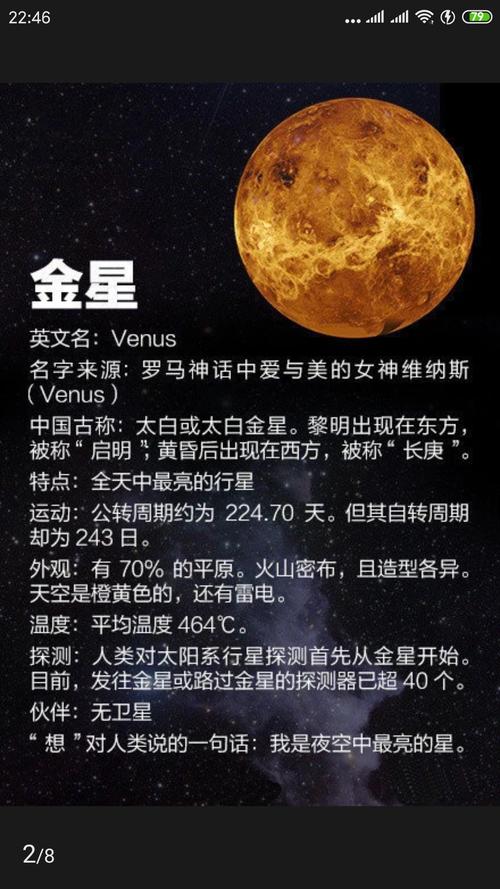 金星:美丽的行星金星是太阳系中最接近地球的行星之一。它的大小和密度与地球相似。它的表面光滑,由岩石和金属组成,覆盖着厚厚的大气层。金星的大气层富含二氧化碳、硫酸盐等化学物质,创造了金星美丽的风景。