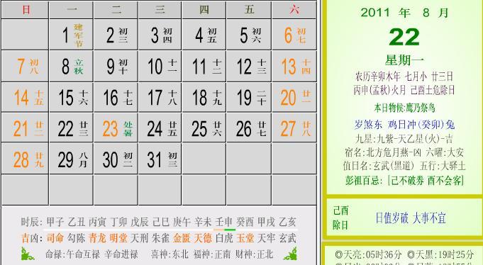 时辰指的是一天24小时中的一个小时,通常以子、丑、寅等十二地支命名。每个时辰都有其特定的黄历,用于预测吉凶、优劣、宜忌等情况。在日常生活中,很多人在选择开业、结婚、搬家、旅游等活动时,会将时辰作为重要参考,以保证顺利和吉祥。