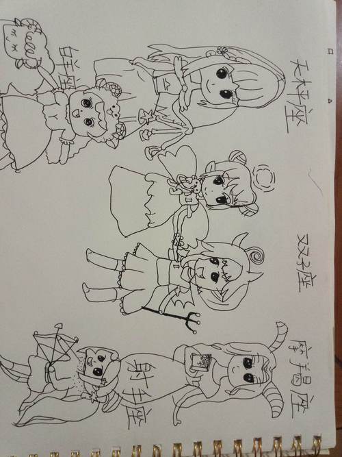 依次画出水瓶座、双鱼座、白羊座、金牛座、双子座、巨蟹座、狮子座、处女座、天秤座、天蝎座、射手座和摩羯座,依次涂上蓝色、紫色、粉色、树莓粉、绿色、红色和黄色等颜色,可爱的q版十二星座公主简笔画就完成啦!