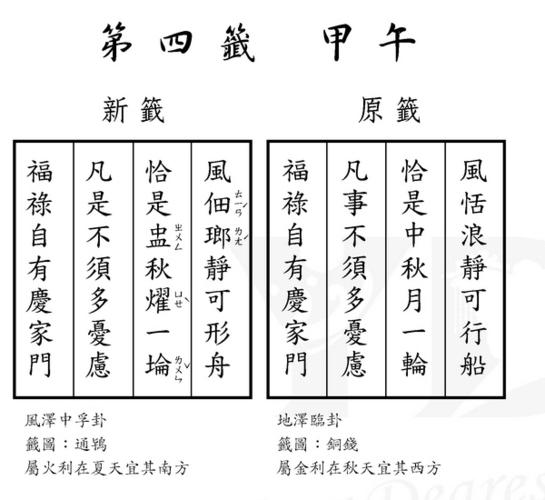 妈祖天后灵签:解曰凡事春吉冬呆.作事春天可成.家事绵绵齐美.家运安居春风.婚姻成者好.求儿平平.六甲先男后女.求财财源广进.功名朱衣点头(及第