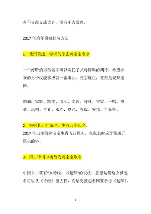 鸡年男宝宝的名字喜欢“小”字形和抬头字的意思,因为小鸡可爱,鸡长大后大多被宰食。此外,鸡昂首阔步代表健康,名字中可以加上抬头的字,这意味着增加祝福,健康顺利。如:士、土、吉、音的字形。鸡年男宝宝名字宜有“山”字形,为鸡上山,可展其英姿,有凤凰象,代表智慧,事业有成。此外,鸡本来喜欢栖息在树干上睡觉,打瞌睡,安宁舒适。但是“酉”金会克木,也有一点瑕疵,所以“木”偏旁要慎用。男孩的名字不仅发音好,而且往往包含着人们对男人的审美期望。自古以来,中华民族就非常重视个人道德和修养,这也反映在给男孩取名时。一个好男孩的名字往往反映了人们对男人优秀性格和外表的期望。