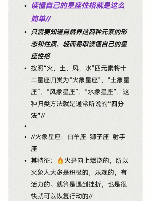 古代占星学家认为,宇宙中的一切都来自火土风水。根据火土风水元素,十二星座可分为火象星座、土象星座、风象星座和水象星座。每个象星座都有自己的特点。