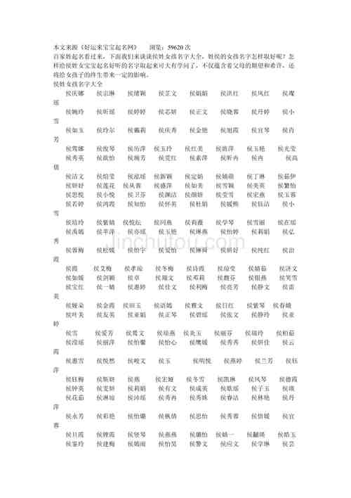 侯字女婴命名的注意事项1. 充分利用字典及相关工具在命名时,我们可以首先理解侯词的含义,从中选择婴儿命名的灵感。同时,我们也可以查阅名称收集、命名工具等相关信息,帮助我们更好地命名婴儿。