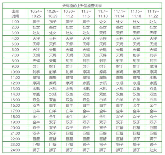 12星座上升在天蝎:(出生时辰对照仅供参考。实际上升星座请参照出生星盘)