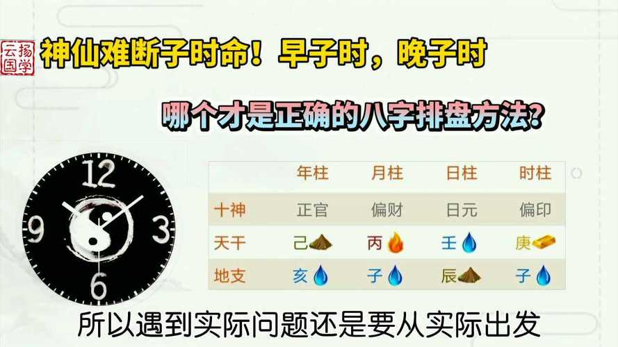 第一种说法是将23:00到24:00之间定为晚子(或晚子),0:00到1:00定为早子(或正子时)。假如刚才那个孩子出生在2017年12月11日晚上23点到24点之间,那就是晚子时。当晚的计算方法是在原歌曲干支相配顺序的基础上顺延另一个。壬日子是庚子,顺数到亥时是辛亥,再数一个是壬子,壬子是这个孩子八字的时柱干支。当然,早子时的计算方法可以根据之前的歌曲配伍。出生于2017年12月12日凌晨0:00至1:00之间,即:丁酉年仁子月桂酉日,按歌诀:戊桂何方发,仁子是真途。当天的时候就是仁子。