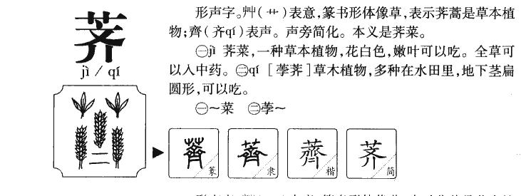 荠,汉语常用词,发音jì,基本意义是指荠菜;读音qí,多年生草本植物的基本含义。