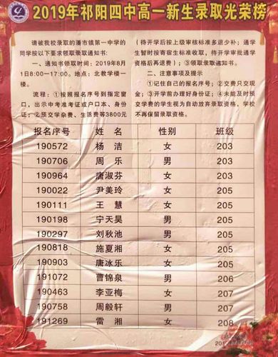 在收到学校领导和招生委员会的最终决定后,祁阳第四中学于7月20日公布了2017年的录取名单。在本次录取中,祁阳第四中学严格按照招生计划和招生规定,根据考生的综合素质、文化成绩、面试表现等因素选择最佳录取。在宣传期间,未被录取的学生可以了解他们的注册信息和结果,并有机会审查结果。