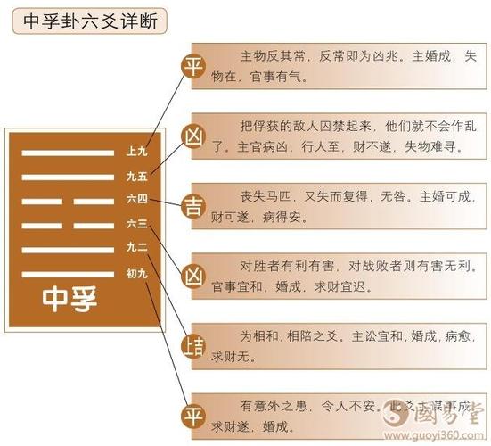 中孚卦,又称“渐卦”,象征着由内向外的渐进式变化。它由“风水涣上,兑为泽,水流至下,渐成川”组成。中孚卦代表着谦虚诚实、感情深厚等意义,但在占卜方面,却需要深入解读其六爻含义,从而确定吉凶。