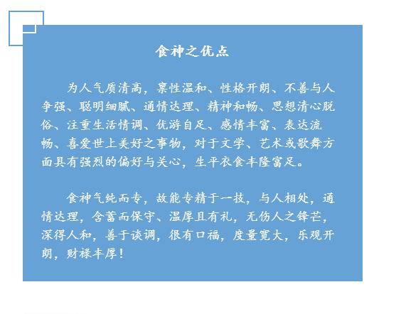 最适应的生活方式来自儿子。什么是儿子?食物伤害也;因为五行关系中的食物伤害是日本主人生的,就像儿子一样。从儿子的角度来看,生活中的食物伤害很强,日本主人很弱,所以他不得不服从。因此,有生命的主人思维极其敏捷,头脑极其灵活,口齿伶俐。