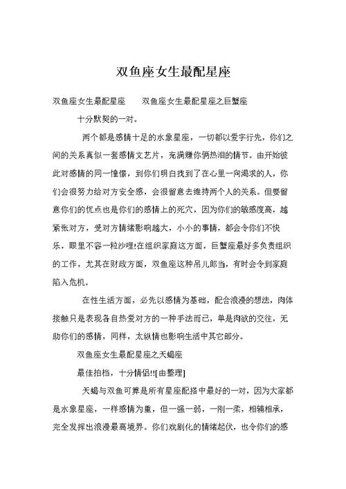 双鱼座是一位敏感、温情、温和的人,她们通常很有艺术气质,同时内心深处充满了浪漫和梦想。但是,双鱼座的内心也充满了矛盾,容易陷入情感困境中。对于双鱼座而言,选择一个合适的星座作为伴侣非常重要。那么,双鱼座和哪个星座最配呢?