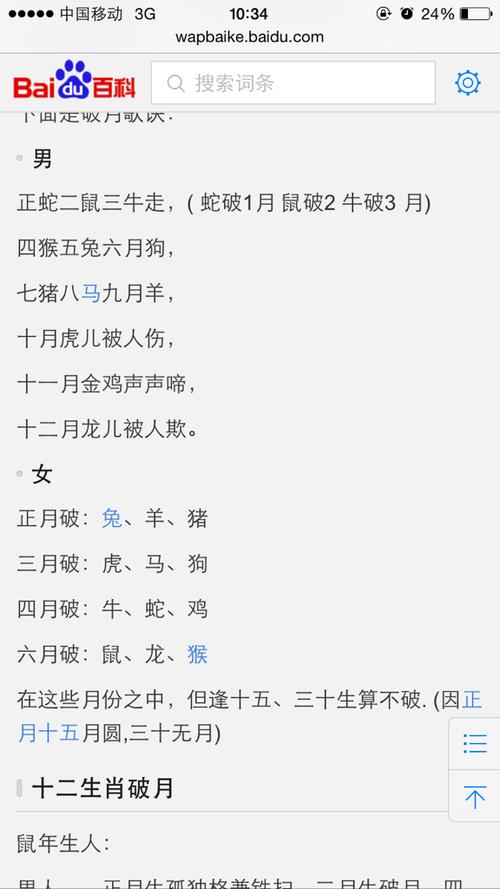 破月:是指生肖在这个月出生的人不应该做的大事。月叫破月,避开这个月!破月有男女之分,月份也不一样。男人十二个月每个月破一个生肖。女人一年只有四个月会破(也就是一个月有三个生肖破)