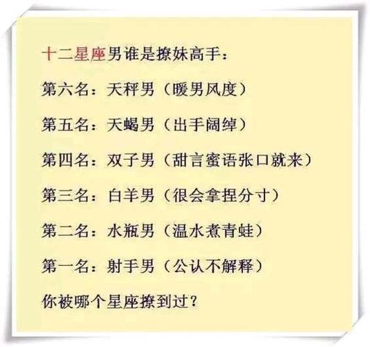 星座男作为一个小清新词汇似乎已经被广大群众所接受,许多人都认为星座男的撩妹技巧很高超。那么,究竟哪个星座男才是最会撩妹的呢?