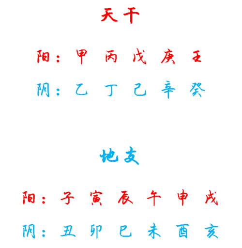 “天干”和“地支”是中国的传统纪时。有十种“天干”,分为五阴五阳。甲、丙、戊、庚、壬阳;乙、丁、己、辛、桂阴。有12个地支,分为6阴6阳。子、寅、辰、午、申、徐阳;丑、毛、思、未、酉、亥阴。“天干”简称“干”,“地支”简称“支”。纪时是“干”配“支”,阴阳配阳总是不变的。年、月、日、时被称为“四柱”,每个“柱”都由一个“干”和一个“支”组成。