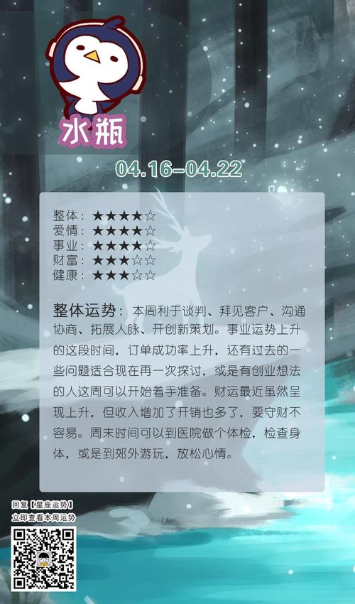 本月份水瓶座在生活或工作方面,会有很不一样的新体验,同时,你会被不少事情折腾到,会感觉有疲惫感。月初,这段时间你手头上要处理的事情多,忙碌后的一阵子,会让你周末显得懒洋洋、无精打采,只好好好休息、补足睡眠一番。中旬,这段时间你会受到一些事的影响,导致心情郁闷、有心事,建议你凡事不能尽你意的,你就只好对那些事情看开点。同时,你跟家人老友会有聚会的机会,会出门去几个地方,虽然奔波但是过程经验显得非常充实满足。月底,这段时间你容易被人惹恼,也会不时觉得疲累、想休息,但是某件事情没搞定前,不仅你没心情想别的事情,而且也毫无喘息的时间啰!