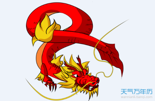 龙在十二生肖中排名第五,与十二地支配属于“辰”一天十二小时中的“辰时”--上午7:00到9:00也叫“龙时”。除以12余数为8的年份,公元都是龙年。