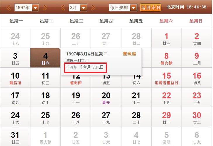 公历:1997年4月22日星期二金牛座农历:3月16日牛年四柱:丁丑甲辰甲午查八字时间(23-1:00)甲子(1-3:00)乙丑(3-5:00)丙寅(5-7:00)丁茂(7-9:00)戊辰(9-11:00)己思(11-13:00)庚午(13-15:00)辛非(15-17:00)壬申(17-19:00)庚酉(19-21:00)甲戌(21-23:0)乙亥节气:生日:蒙宁28:00:00:00:00):已过去6502天