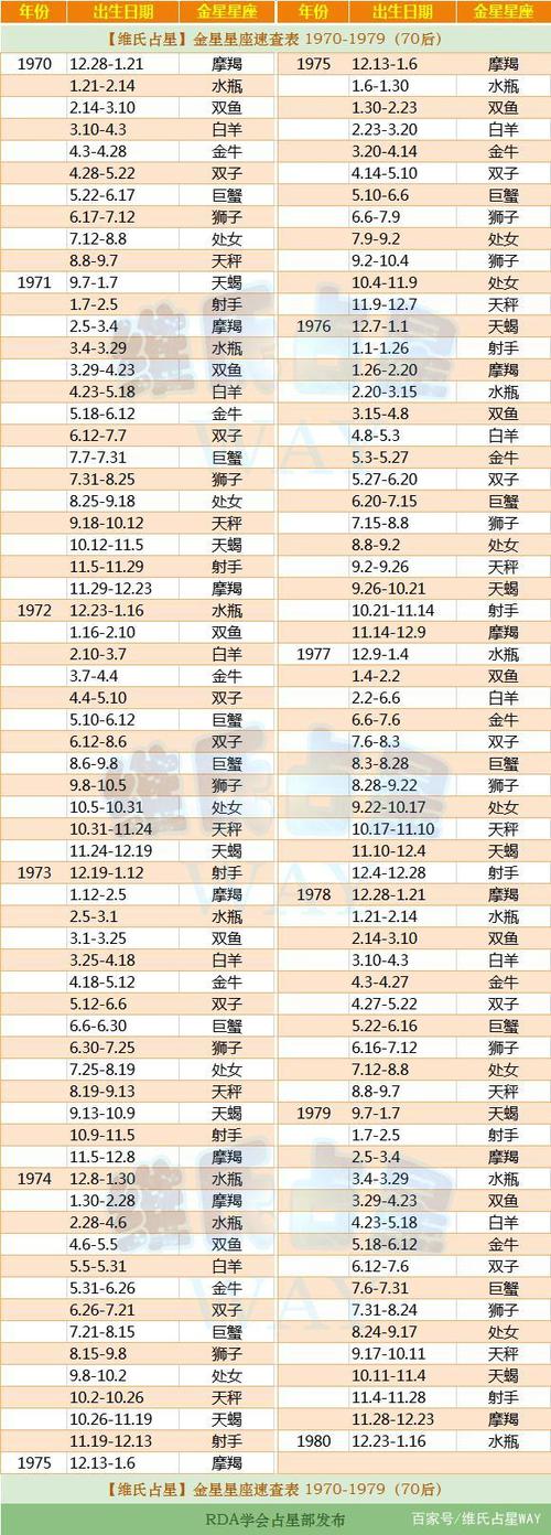 在精确的金星星座查询表中,其金星查询方法如下:1、查星历,查出生时金星的星座度数。2、在网上查出金星出生时的星座度数。
