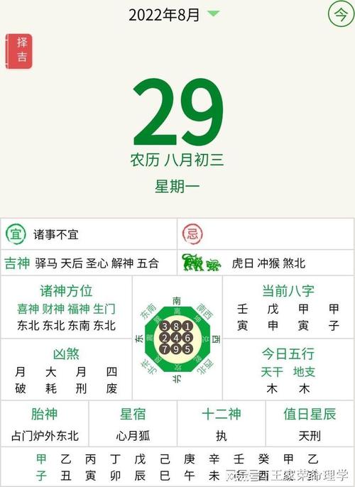 此外,我们还应该注意今天的风水。根据风水理论,2011年8月29日的布局相对稳定,适合大事务。然而,如果你想搬家或装饰房子,你需要注意选择一个好的地方和方向。此外,好运和坏运气也与每个人自己的八个字和命理学有关。如果你想知道你的好运和命运,你可以找到一个专业的风水先生或命理学家来帮助分析。