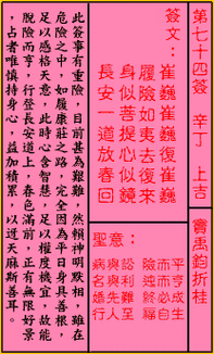 [解释]这个签名很好。希望成功,一切顺利,家庭繁荣。诉讼必胜,不再繁荣,名利,婚姻自成,行人回归,疾病不用担心。财务利润是任意的两倍。风水利,孕妇和女儿。一切,都要小心,保持自己。