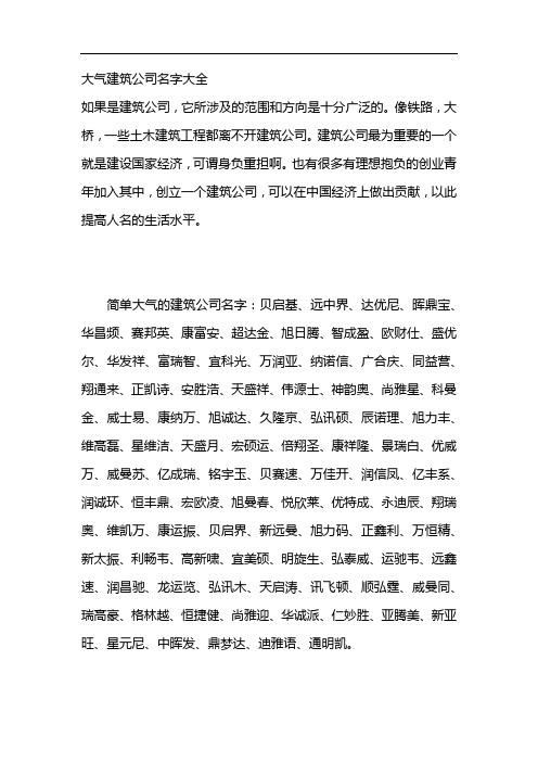 建筑设计公司要大气好听: 正韵、乐派、宝拓、肯筑、华水、艾森、建宏、威胜 通过企二哥公司命名系统可以获得更多好听的建筑设计公司名称。