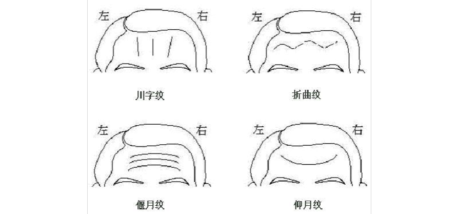 八字纹:眉心印堂,山根主刑妻,劳累而长寿,但常头痛。