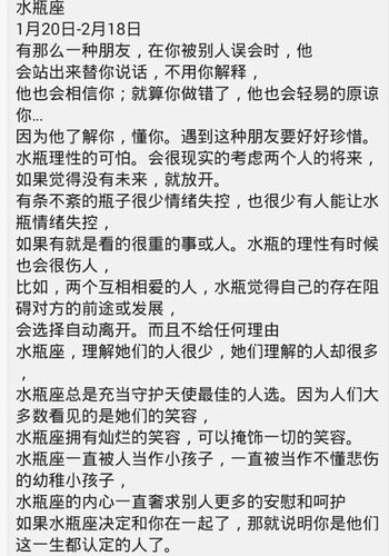 当你看到你的话时,坦白地说你不懂水瓶座。事实上,水瓶座女孩和每个人都有很好的潜台词,实际上是在友好关系下与每个人保持距离。不只是水瓶座女孩,水瓶座男孩也是如此。那为什么水瓶座女生要善待别人,让自己看起来和别人都很好呢?其实答案很简单,因为水瓶座女生怕麻烦。善待他人,善待任何人都可以省去很多麻烦,需要的时候也可以多方便。为什么不呢?
