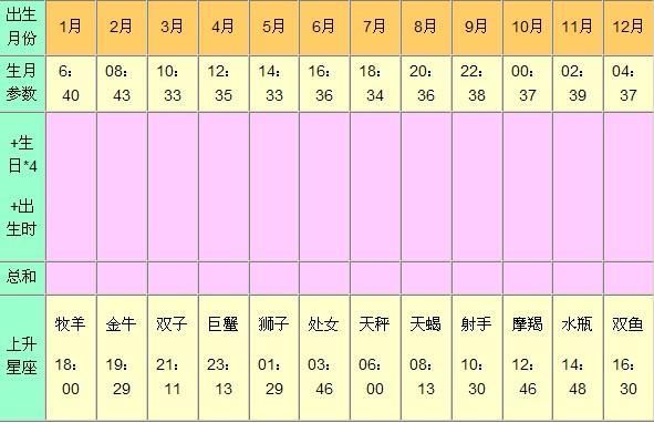 出生月参数(表1) 生日数字*4 出生时间=计算出来的时间(表2)得到上升星座