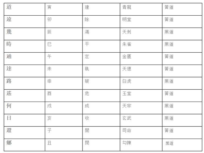 子午临申地,丑未戍上寻,寅申居子位,卯酉却加寅,辰戌龙位上,已亥午中行。一青龙黄,二明堂黄,三天刑黑,四朱雀黑,五金匮黄,六天德黄,七白虎黑,八玉堂黄,九天牢黑,十玄武黑,十一司命黄,十二勾陈黑。