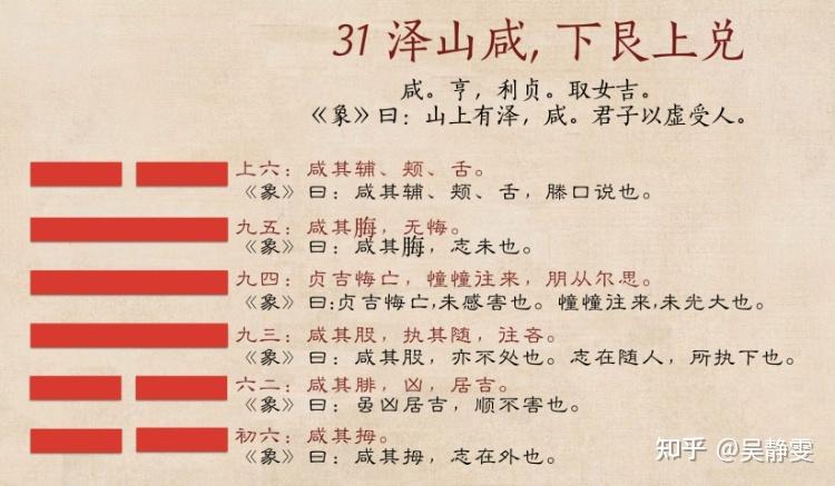 周易31卦的象传告诉我们,只有在把阳性能量应用到正确的方向上,我们才能获得成功。这和其他卦象中有关充满生机和怒气的卦象组成了一个并存的系统。最终,这些组成了有关和谐和平的周易体系,向人们提供了一种认识自然界和人类社会的新方法。