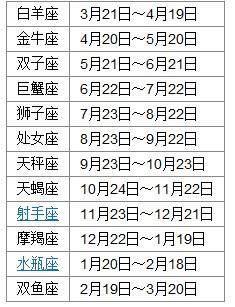 比如白羊座是3.21-4.19,金牛座是4.20-5.20,双子座是5.21-6.21