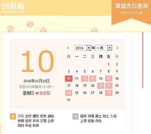 解释一下,黑是黑道日,意思是建、满、平、收四天是黑道日,是应该避免的日子。黄是黄道日,意思是除、危、定、持四天是黄道日,可以使用。不敢当也是不可用的日子,也就是说,破、闭两天也应该关闭。成、开两天也可以用黄道日。这样一个月,除、危、定、持、成、开六天就是黄道日,俗称黄道吉日。
