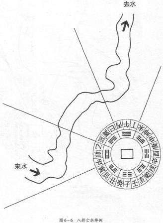 这个口诀的意思是说,二十四山中的八天干和四维卦作为建筑立向时,周围的水流出水口在哪些方向是不吉利的。如“甲癸向上忧见艮”,即是说当建筑立甲或癸向时,艮方出水是不吉利的。而反过来,“艮逢甲癸祸连连”是说当建筑立艮向时,甲和癸两个方向出水都是不吉利的,所以称为天干反复黄泉(表6-46和图6-77、图6-78)。