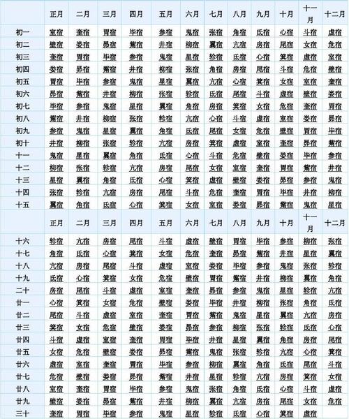 二十八星宿查对表