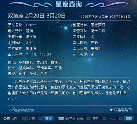 出生于三月17日的人属于双鱼座。双鱼座的生日范围是2月19日至3月20日。双鱼座是黄道十二宫中的第十二个星座。