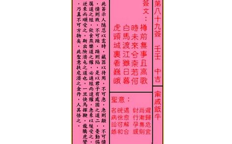 此签文凡事都有贵人相助。格局(求什么对应)家宅欠(家宅欠安详),自身作福(自己要多求福),求财遂意{不能强求(顺其自然)},交易合(交易能成功),婚姻阻{婚姻有阻碍(两人在一起困难)},六甲作福{六甲(要孩子那要祈求)},行人有危(要出去外面的人有危险),田蚕六畜不利(良田蚕桑猪牛羊等收成不好),寻人难(找人帮忙有困难),讼亏(打官司会亏损好多人力物力财力),移居欠吉(乔迁不怎么好),病安(病能安康)