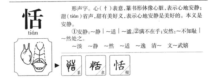 田字典义分析在《说与解》中,文字被解释为“内心的舒适”,这意味着舒适,没有烦恼和担忧。这个词由“原因”和“心”组成,其中“原因”代表因果关系,而“心”指的是内心和精神意识。因此,文字的含义可以理解为:因为内心的平静和舒适,我感到快乐和满足。