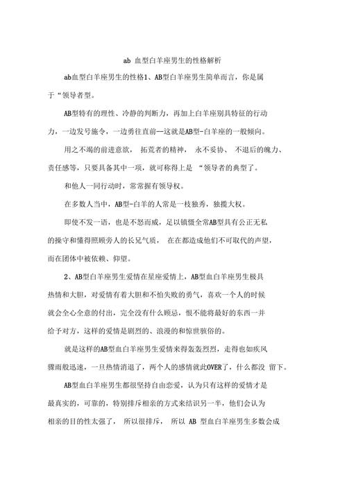白羊座AB血型人是一种独特的个性,具有开朗、活泼、热情、直率、乐观、理性、直觉的特点。这种人的优点是自我控制和适应能力强,勇气和冒险精神强,所以他是一个非常有创意的人。