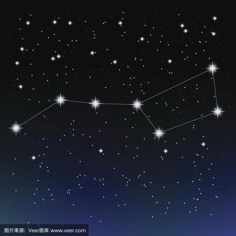 北斗七星属于大熊星座,由七星形成勺子形状,通常被称为勺子星,根据北斗七星很容易找到北极星。在四季中,它绕着北极星逆时针旋转,它在天空中的位置不断变化,但形状没有改变。