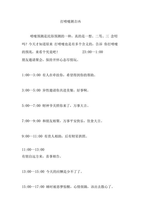 中国有一个古老的传统,即根据打喷嚏的时间来判断好坏。自古以来,人们对好坏有着特殊的敏感性。因此,在打喷嚏的那一刻,人们会特别关注周围的环境和自己的感受,希望得到一个好的预兆。