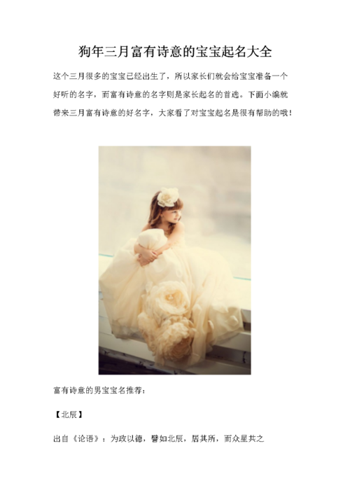 精彩:狗年的名字是合适的词,代表着美丽、明亮、动人、完美的意义,意味着完美、优雅。精英:指华才、精英、非常有才华的人,意味着充满经验,龙凤。狗年3月,婴儿被命名为01、冷玉问香平蓝凝芙初瑶、安静的白色念柏尔冬采萱傲